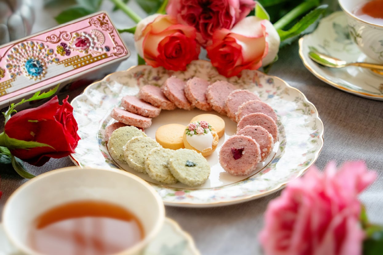 バラの香りのディアマンクッキーにローズペタルをトッピング。